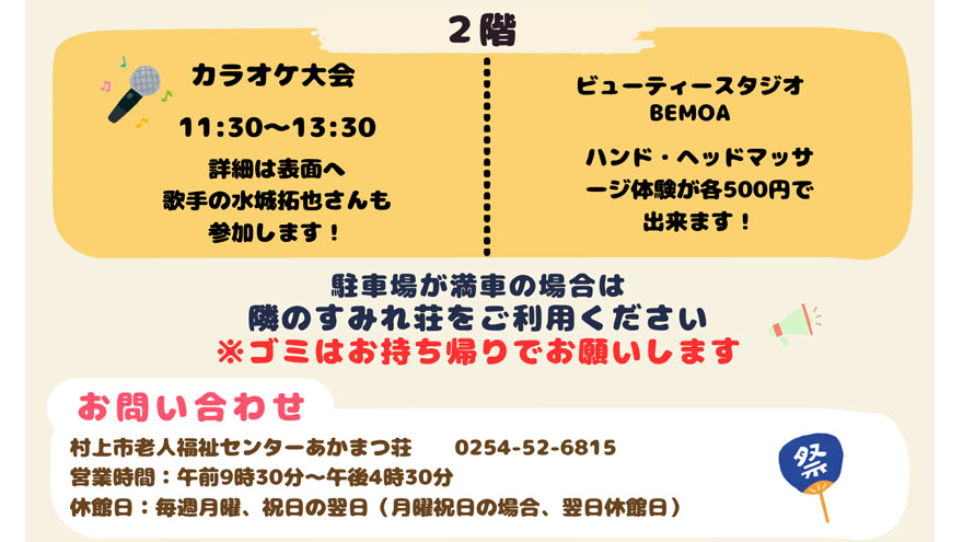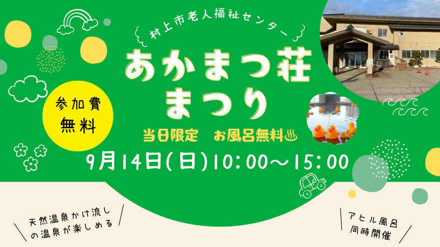 住所 | 村上市瀬波温泉1-2-8 村上市老人福祉センターあかまつ荘 |