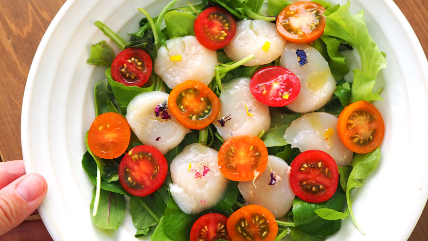 「白いダイヤ」に脇坂園芸(阿賀野市)のエディブルフラワー(食用花)を乾燥させたものが入っています。オリーブオイルと相性がいいのでカルパッチョやカプレーゼに。塩むすびに使えば見た目もパッと華やかになります。