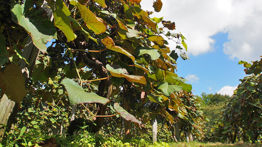 ヤマブドウの木は葉が大きく、巻きひげが多いため、収穫にはかなり手が掛かります。「高根のヤマブドウは原種に近いためか、摘み取るのも大変です」(職員)