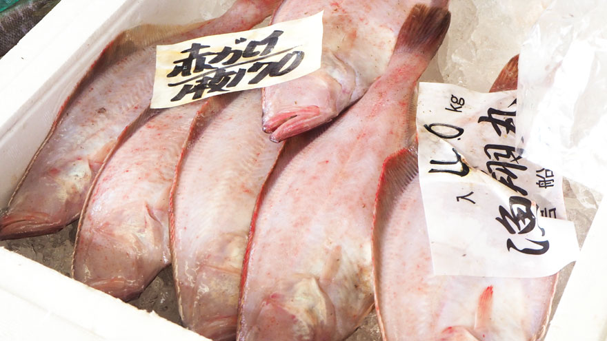 予想通り(やった!)、前日に船が出たそうで、売り場には新鮮な魚介がいっぱい! 店の方いわく、一年を通じて獲れる魚ばかりとのことでしたが、海が凪いでいる春だからこそ出合える魚介ともいえそうです。上の写真はカナガシラ